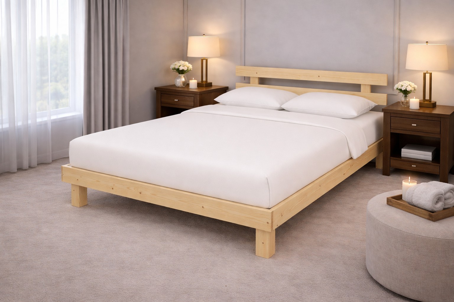 מיטה איכותית מעץ אורן טבעי, כוללת מזרן קפיצים אורטופדי מדגם H Sleep וראש מיטה תואם בעיצוב אלגנטי.